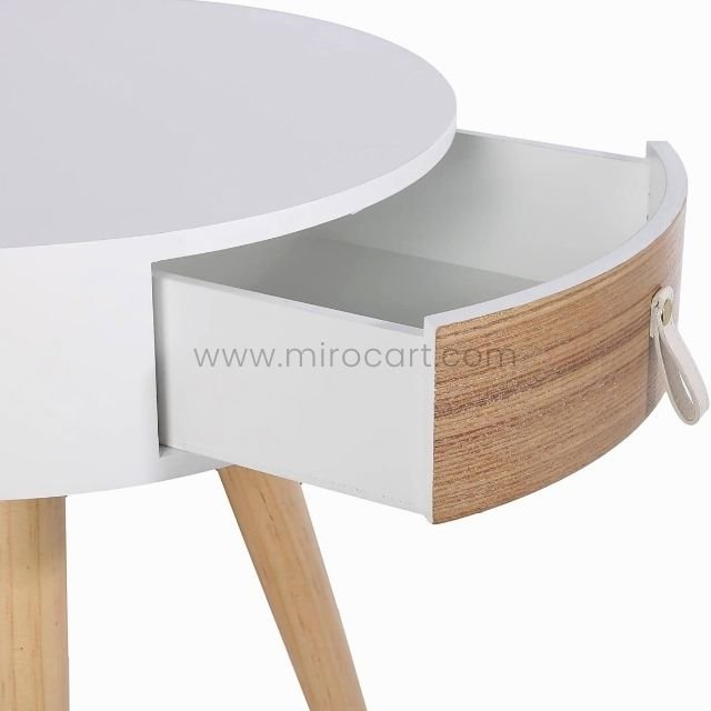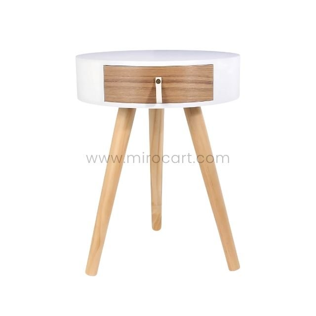 Modern Bedside Table – Round Top, Wooden Legs & Drawer